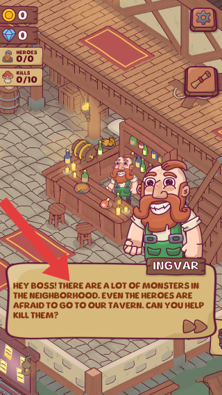 2、角色I(xiàn)NGVAR向玩家(BOSS)反饋:附近有很多怪物,連英雄都不敢來酒館,請求幫忙消滅怪物,呈現(xiàn)游戲初期任務(wù)引導(dǎo)場景。