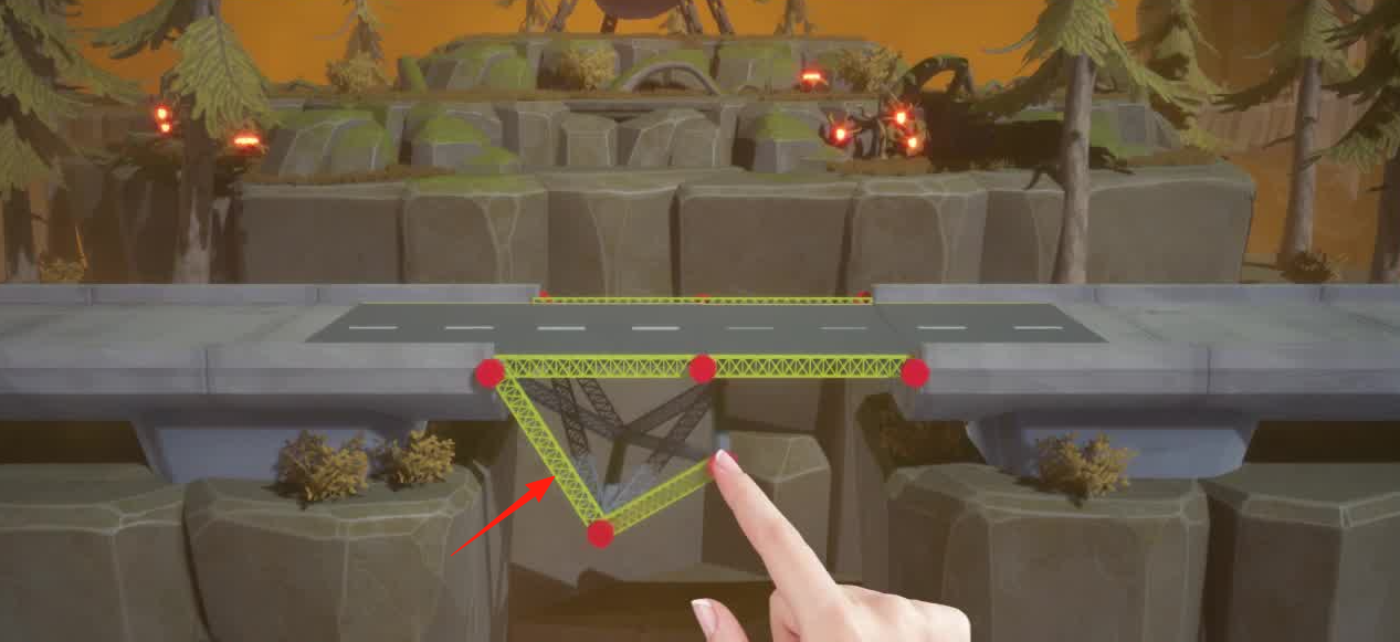1、在森林場(chǎng)景(紅箭頭),拖動(dòng)黃色框架,搭建三角結(jié)構(gòu),強(qiáng)化橋梁承重。
