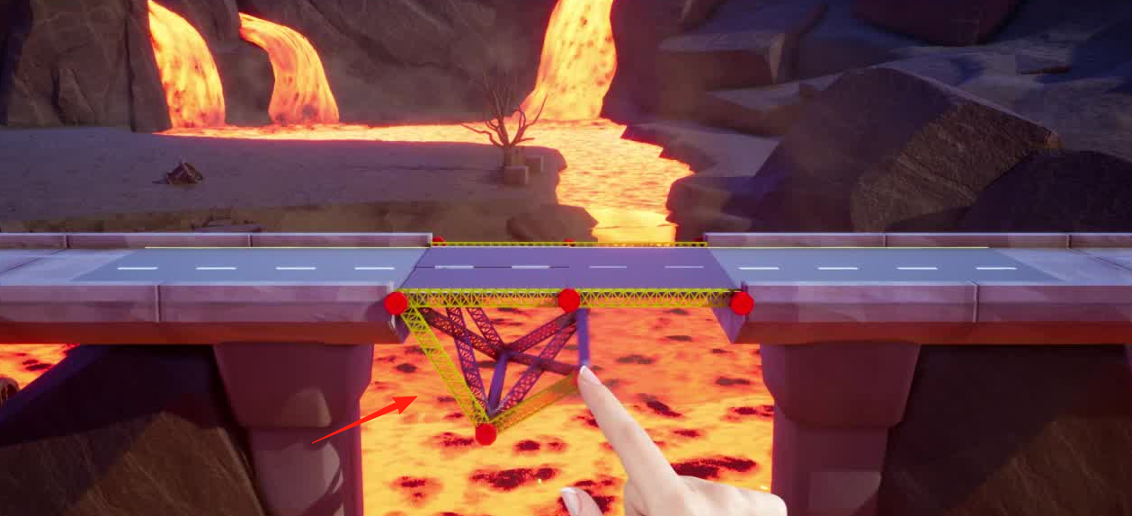 2、切換熔巖地圖(紅箭頭),添加紫色支架,優(yōu)化橋體設(shè)計(jì),抵御高溫環(huán)境。