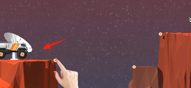 3、進(jìn)入太空關(guān)卡(紅箭頭),規(guī)劃路徑,用手指點(diǎn)擊(紅箭頭)放置節(jié)點(diǎn),助車輛跨越懸崖。