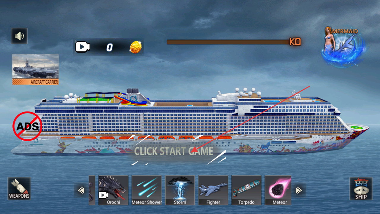 1、點擊“CLICKSTARTGAME”按鈕,開啟游輪對戰(zhàn),選擇武器(如MeteorShower)準備攻擊。