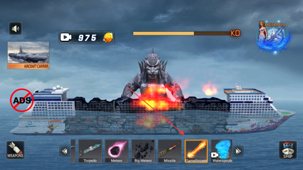 3、戰(zhàn)斗中切換不同武器(Torpedo、Flamethrower等),消耗怪獸血量,直至KO目標,推進關(guān)卡。