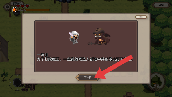 2、畫(huà)面呈現(xiàn)的是開(kāi)場(chǎng)劇情對(duì)話,講述“一年前為打敗魔王,英雄候選人被派去作戰(zhàn)”的背景故事,【下一頁(yè)】按鈕用于推進(jìn)劇情流程。