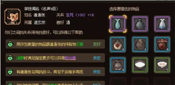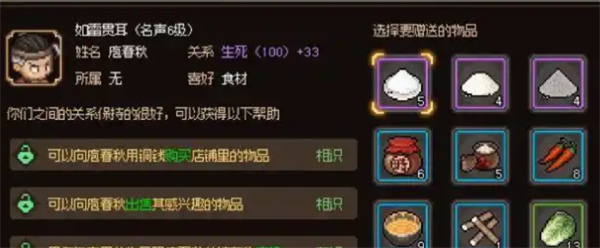 1、選對(duì)應(yīng)NPC喜好物品(如唐春秋喜食材、通通張好酒)贈(zèng)送,提升“生死”關(guān)系等級(jí),解鎖合作/交易權(quán)限。