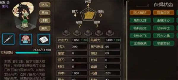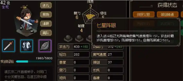 2、進(jìn)入角色界面,查看NPC體質(zhì)、攻防等屬性,了解戰(zhàn)力與特質(zhì)(如“七星陣眼”被動(dòng))。