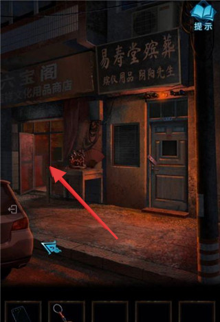 2、遇到“易壽堂殯葬”店鋪,按箭頭指引,點擊門/互動點,進入探索,留意店內物品(如花圈、柜臺)找道具。