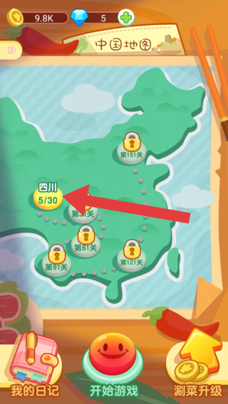 2、呈現(xiàn)“中國地圖”關(guān)卡選擇,有“四川”等區(qū)域及對應(yīng)關(guān)卡進(jìn)度(如四川5/30),還有“我的日記”“開始游戲”“涮菜升級”等功能按鈕,玩家可通過關(guān)卡經(jīng)營火鍋店。
