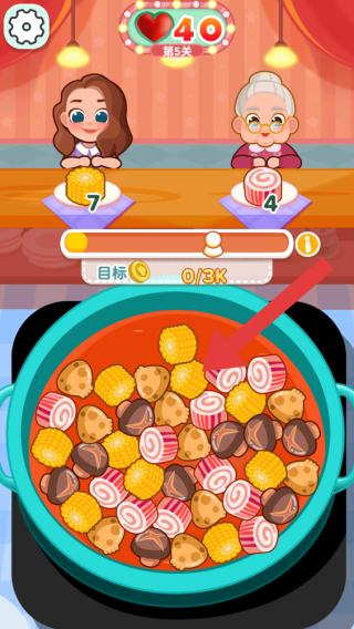 3、呈現(xiàn)第5關(guān)內(nèi)容,有兩位顧客及對應(yīng)菜品需求(玉米7、肉卷4),火鍋內(nèi)有多種食材,目標(biāo)是賺取3K金幣,玩家需通過為顧客提供對應(yīng)食材完成關(guān)卡。