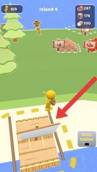 2、呈現(xiàn)了“Island4(島嶼4)”場景,有角色、資源(木材、肉類等)顯示,還有“AutoGather(自動收集)”功能按鈕,玩家可在島嶼上進(jìn)行收集、建造等經(jīng)營探索。