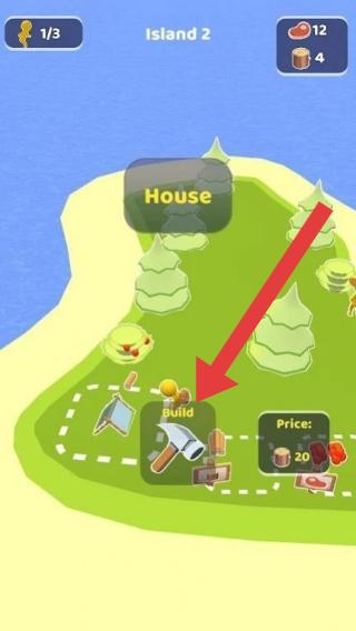 3、顯示處于“Island2(島嶼2)”場景,有建造房屋(House)的功能,點(diǎn)擊“Build(建造)”按鈕可消耗資源(木材等)進(jìn)行房屋搭建,是島嶼經(jīng)營建造類玩法。