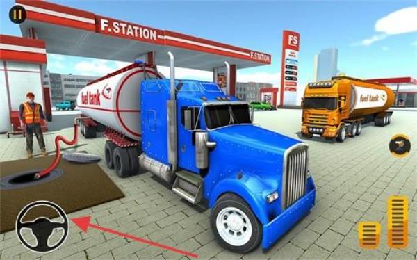 1、在加油站(F.STATION),用方向盤控藍(lán)色油罐車,對接油口,完成加油。