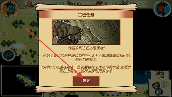 3、“古巴任務(wù)”界面,提示征服掠奪至少3個土著城鎮(zhèn)保障殖民地安全,完成次要目標(biāo)體現(xiàn)價值,點(diǎn)擊“確定”開始任務(wù)。