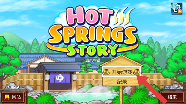 1、英文名稱“HOTSPRINGSSTORY”、中文名稱“溫泉物語”,還有“開始游戲”“紀錄”“網(wǎng)站”“結(jié)束”等功能按鈕,呈現(xiàn)出日式溫泉旅館的背景場景。