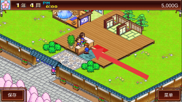 2、呈現(xiàn)的是溫泉旅館經(jīng)營場景,實體信息有時間、金幣,還有“保存”“菜單”功能按鈕,畫面中是旅館庭院、建筑及人物互動場景,屬于該模擬經(jīng)營常規(guī)經(jīng)營界面。