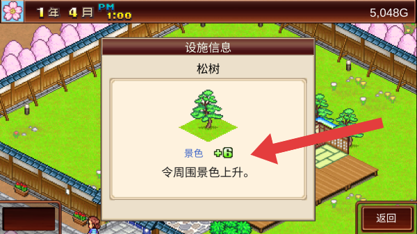 3、時間“1年4月PM1:00”、金幣“5,048G”,設(shè)施“松樹”,其屬性為“景色+6,令周圍景色上升”,還有“返回”按鈕,屬于設(shè)施信息查看界面。