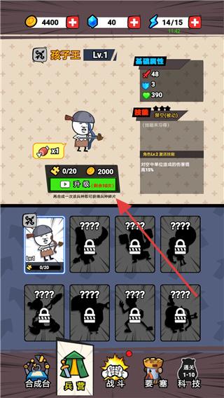 3、兵營界面,選中“孩子王”,滿足0/20、2000條件時,點擊【升級】,提升角色屬性與戰(zhàn)力。