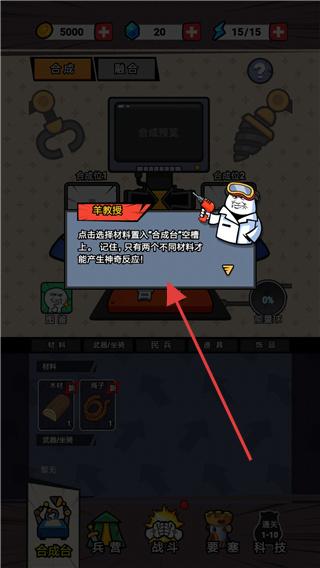 1、合成臺界面,按【羊教授提示】,選兩個不同材料放“合成創(chuàng)槽”,觸發(fā)神秘反應,獲取新物品。