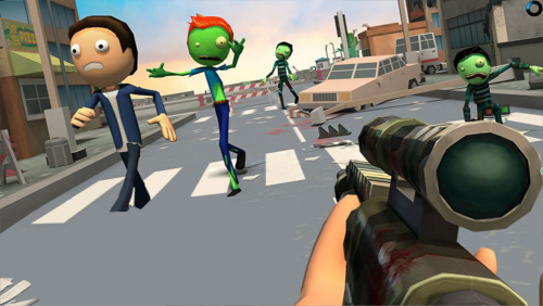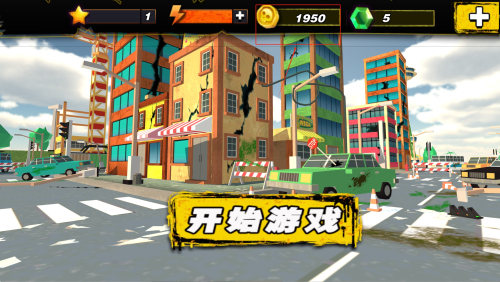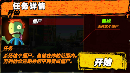 3、接受"殺死僵尸"任務,鎖定綠色僵尸目標快速射擊,防止其逃竄轉化平民,完成后點擊"開始"繼續(xù)下一任務。