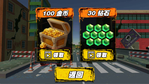 2、在獎勵界面選擇領取100金幣或30鉆石獎勵,點擊對應"領取"按鈕獲取資源,用于購買裝備或解鎖角色。