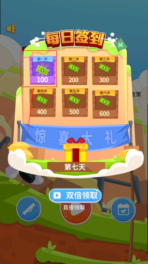1、在簽到界面查看7日獎(jiǎng)勵(lì)進(jìn)度,點(diǎn)擊紫色高亮的"第一天"領(lǐng)取100金幣,選擇"直接領(lǐng)取"或觀看廣告"雙倍領(lǐng)取"。