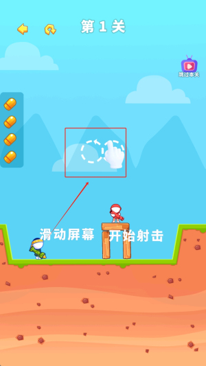 3、開(kāi)始第1關(guān)游戲,按照左上角提示滑動(dòng)屏幕控制角色移動(dòng)和瞄準(zhǔn),觀察地形計(jì)算彈道軌跡完成射擊挑戰(zhàn)。