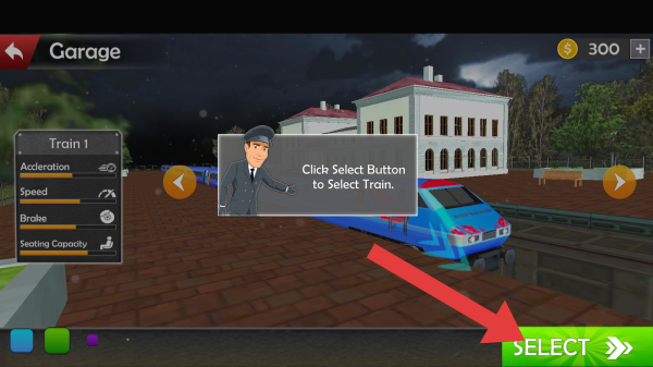 1、場景“Garage”(車庫)、火車“Train1”及屬性,提示文字點擊選擇按鈕選火車,“SELECT”(選擇按鈕)、金幣,玩法是選擇火車進行模擬駕駛、運輸?shù)炔僮鳌?