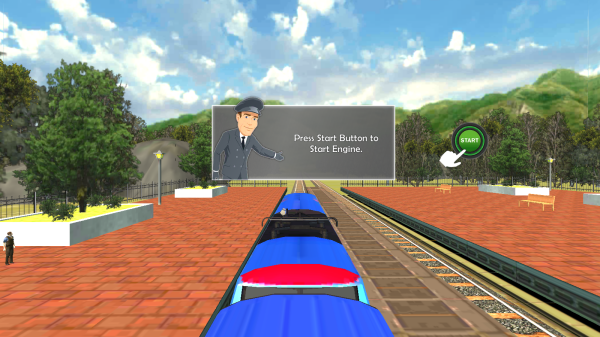 3、提示文字按下啟動按鈕發(fā)動引擎,點擊【START】按鈕、火車、車站場景、角色(列車員形象),玩法是按提示操作啟動火車,進行模擬駕駛運輸任務。