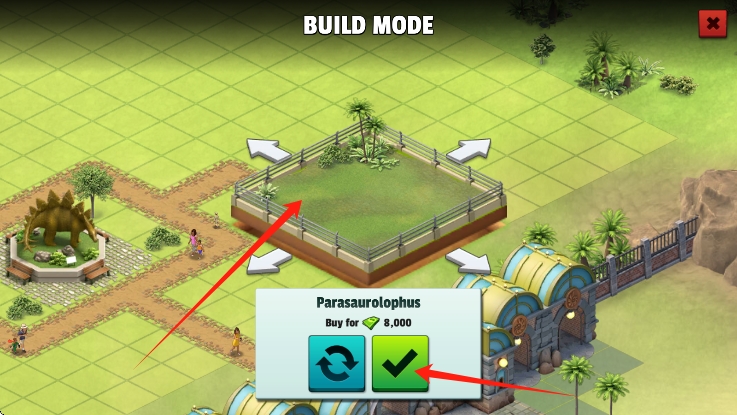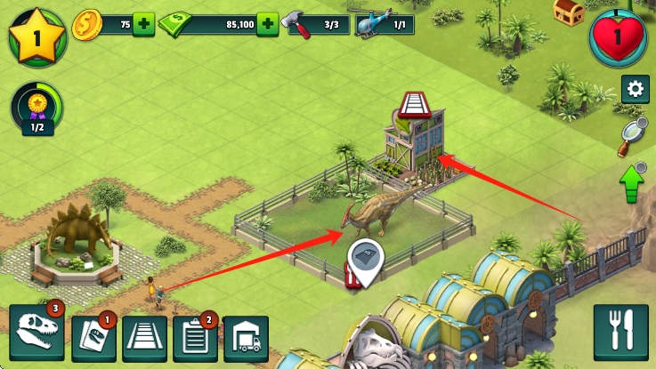 1、基礎(chǔ)建造操作:拖拽屏幕規(guī)劃圍欄區(qū)域,點擊地塊放置孵化艙與觀景臺,滑動菜單調(diào)配恐龍飼料配方。