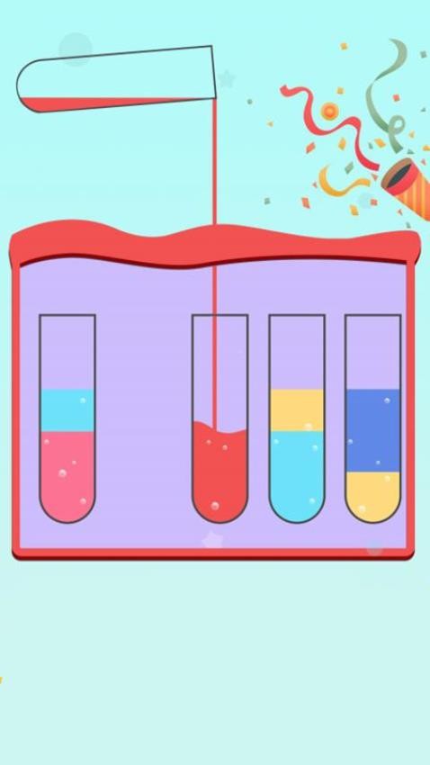 1、游戲開(kāi)始后,需要通過(guò)拖拽操作,將不同試管中的同色液體進(jìn)行合并歸類。