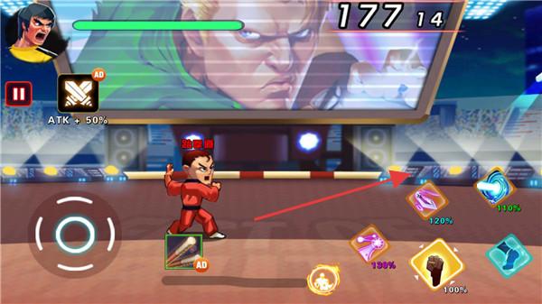 3、戰(zhàn)斗界面,操控紅色格斗角色,利用技能(如12.0%、13.0%傷害技能),在擂臺(tái)對(duì)戰(zhàn),注意血量(177)和技能冷卻,擊敗對(duì)手。