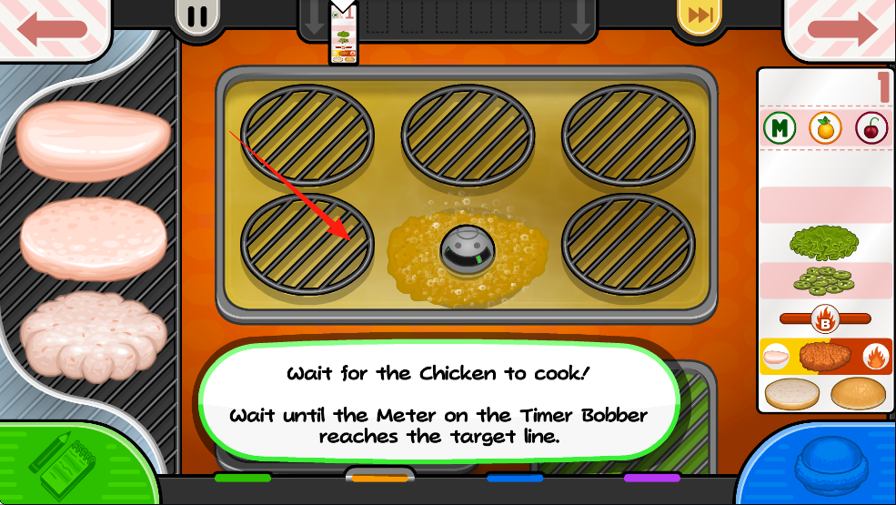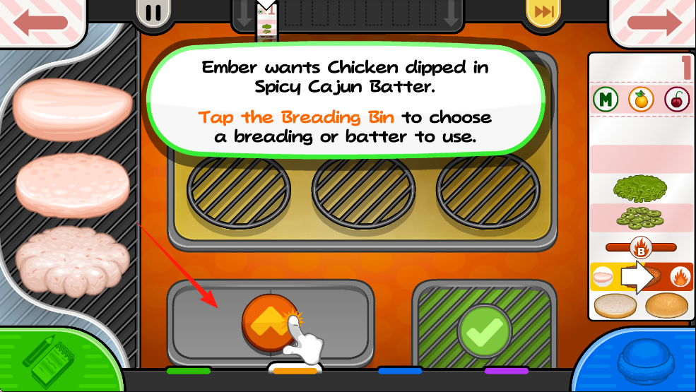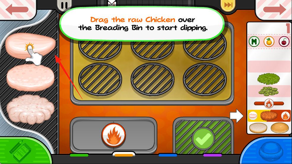 1、點(diǎn)擊面包糠箱選面糊,拖生雞肉蘸取,放烤架,等計(jì)時(shí)器達(dá)標(biāo)完成。