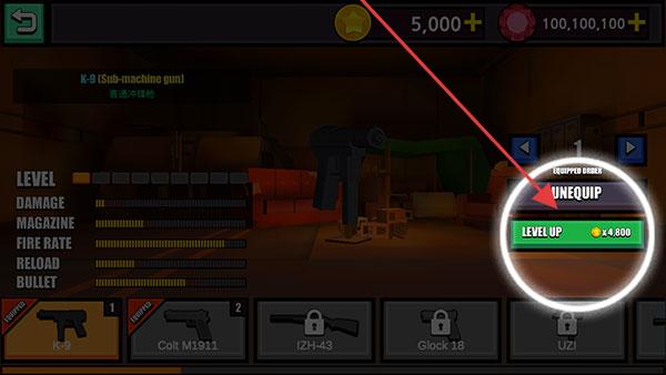 1、武器界面,選“K-9”沖鋒槍,點擊【LEVEL UP】,花費金幣提升等級,增強武器屬性,助力戰(zhàn)斗。