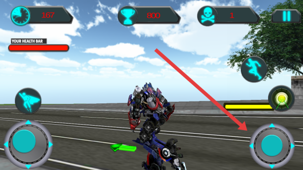 3、在戰(zhàn)斗中,操控機器人移動,點擊右側圓形按鈕攻擊敵人,留意血量與時間條,完成救援任務。