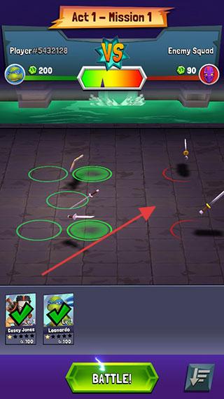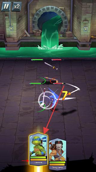 3、戰(zhàn)斗中,點擊箭頭指向的忍者神龜卡牌(如萊昂納多),釋放技能,攻擊敵人,配合隊友,贏取勝利。