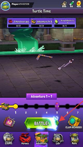 1、在“Turtle Time”界面,點擊【BATTLE!】,進入“Adventure1-1”關(guān)卡,準備用忍者神龜戰(zhàn)斗,推進冒險。