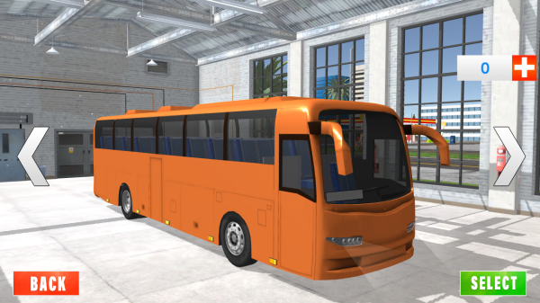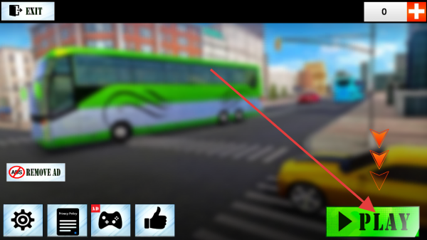 1、主界面點綠色【PLAY】,進車庫選橙色巴士,點【SELECT】確認,若想免廣告,可看提示操作,準備城市駕駛。