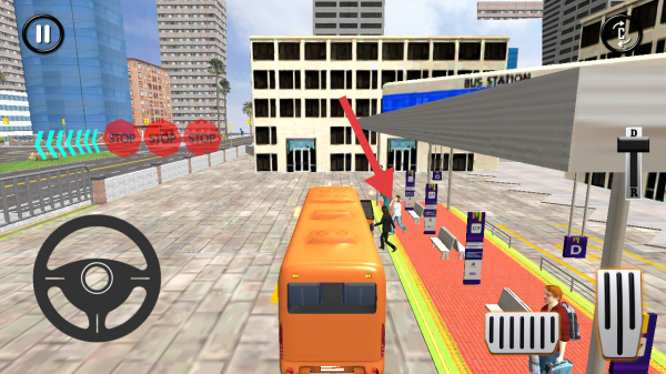 2、駕駛橙色巴士,用方向盤控方向,右側按鍵管油門、剎車,到公交站,輕踩剎車停穩(wěn),等乘客上車,別碰撞行人與建筑。