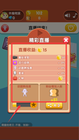 3、拿到獎勵(lì)后優(yōu)先升級角色基礎(chǔ)屬性和技能等級,增強(qiáng)直播表現(xiàn)力。