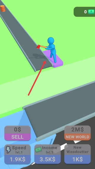 1、砍木作業(yè):操控藍色小人,揮動斧頭砍伐傳送帶上滾動的原木,積累資源。