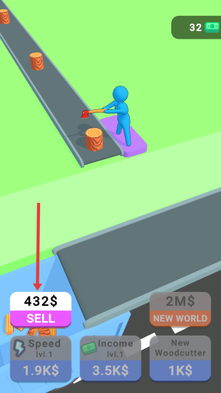 3、資金兌換:點擊左下角紫色“SELL”按鈕,將庫存木段變現(xiàn),賺取金幣。