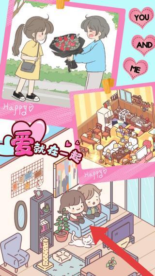 2、實體信息有文字“YOUANDME”“Happyday”“愛就在一起”,呈現(xiàn)了情侶送花、居家等甜蜜場景,風格可愛溫馨。