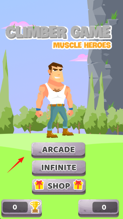 1、模式選擇主界面選“ARCADE(街機(jī))”“INFINITE(無(wú)限)”模式,或“SHOP(商店)”購(gòu)道具,控制肌肉男角色開始攀巖。