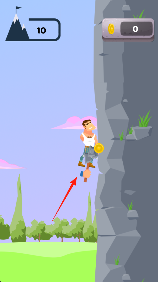 2、攀巖操作在巖壁場(chǎng)景,點(diǎn)擊屏幕讓角色揮斧抓巖點(diǎn),向上攀爬,收集金幣,界面顯示“10→11”關(guān)卡進(jìn)度,注意躲避障礙。