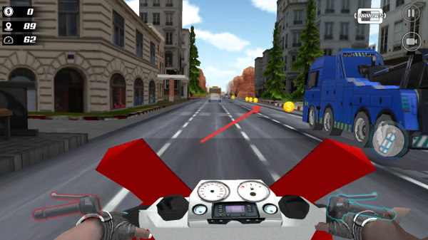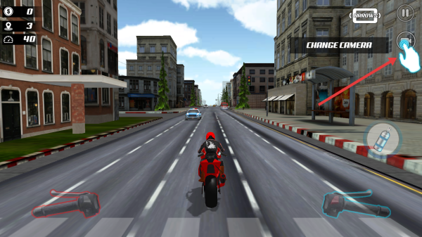 2、游戲中,點(diǎn)“CHANGE CAMERA”切換視角(如第一人稱),助你更沉浸駕駛,遇金幣(黃色圓形)盡量收集,可用于解鎖新摩托、升級(jí)屬性。