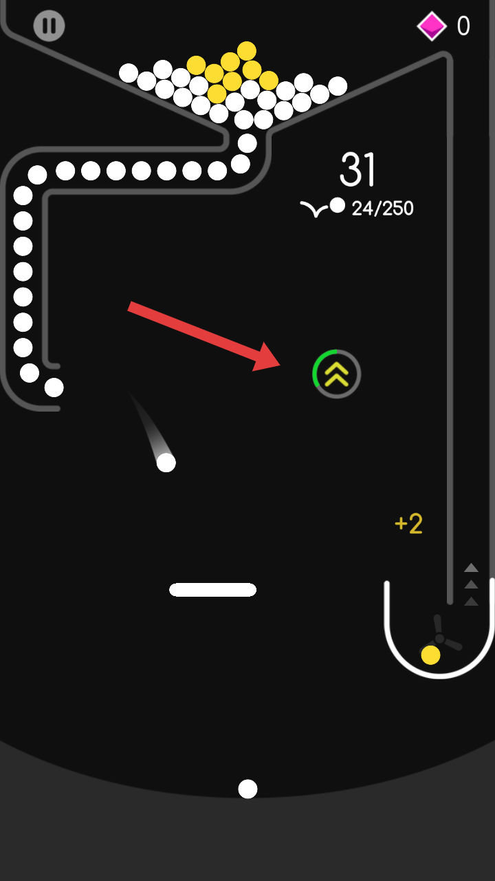 3、持續(xù)操控,讓小球撞擊同色球(如黃色球堆積區(qū)域),獲取加分同時留意綠色升級圖標,提升小球能力。