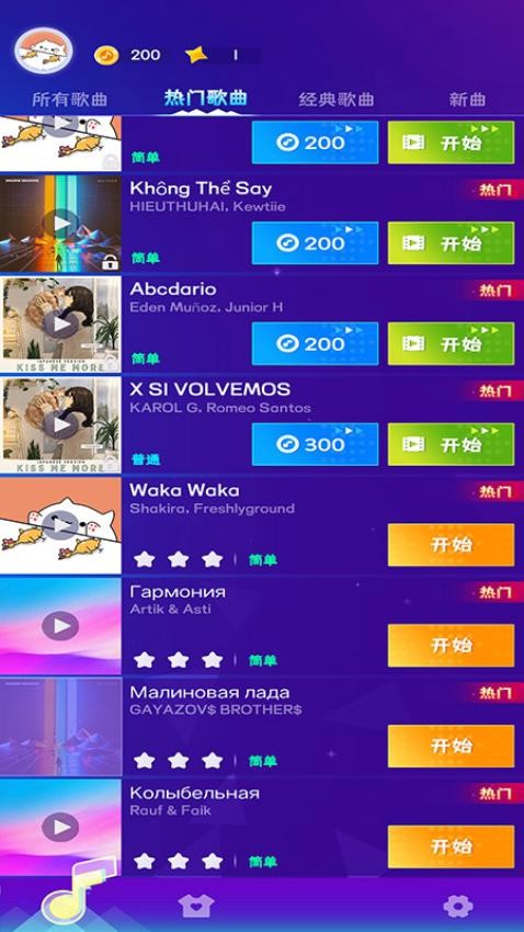 1、曲庫系統(tǒng)包含100首經(jīng)典樂曲,從流行音樂到古典名曲應(yīng)有盡有。每首曲子都配有獨(dú)特的節(jié)奏譜面和難度等級。