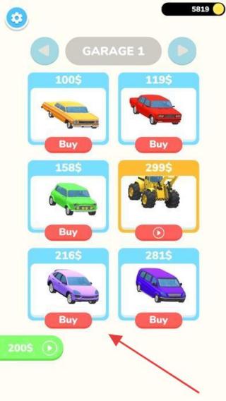 1、在車庫界面,用金幣選“Buy”心儀車輛(如綠色小車),解鎖后加入特技挑戰(zhàn)陣容。