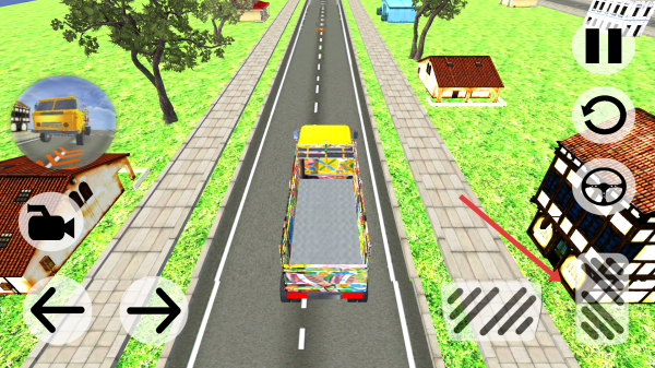 2、駕駛貨車:在道路場(chǎng)景,用虛擬按鍵(方向、剎車)操控彩色貨車,避開障礙。