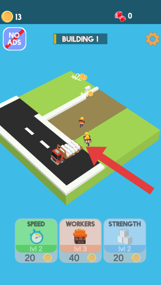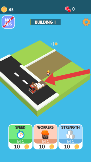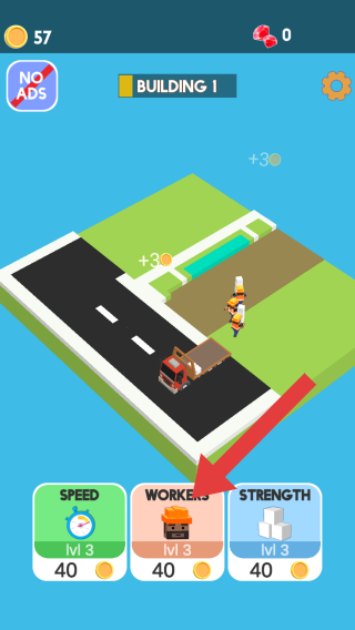 1、實體信息有“BUILDING1”、“NOADS”,以及速度、工人、力量的升級界面,呈現(xiàn)的是建筑施工場景,屬于休閑模擬建造,玩家可通過升級屬性推進建筑進程。