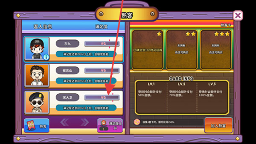 2、顧客管理:進(jìn)入“顧客”頁面,招攬不同星級顧客(如“張萬”“董兵白”),提升滿意度,解鎖專屬加成。